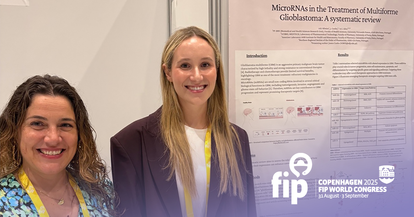 Durante o encontro, apresentou o poster científico intitulado “The Role of microRNAs in the Treatment of Multiforme Glioblastoma: A Systematic Review”, desenvolvido em coautoria com Ana Rita Ribeiro, também estudante do MICF da UFP. O trabalho teve origem num projeto de grupo realizado na Unidade Curricular de Biotecnologia Farmacêutica e Terapias Avançadas (4.º ano do MICF), sob orientação da Professora Doutora Ana Catarina Silva.